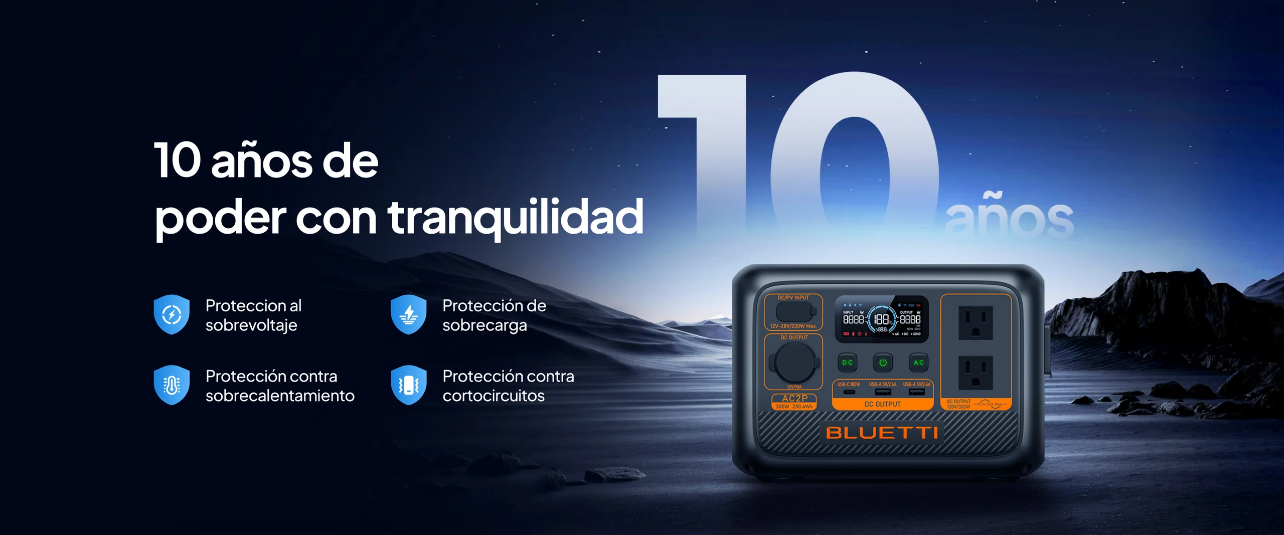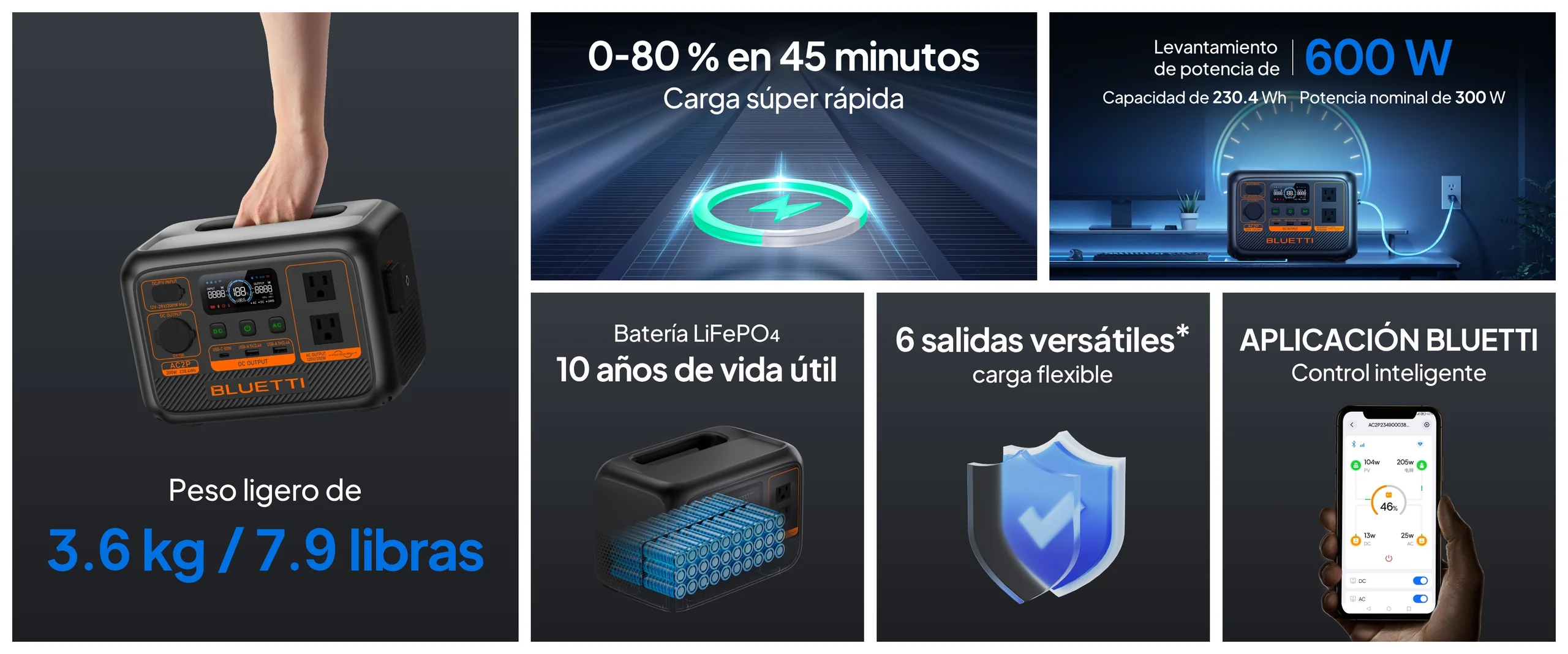 BLUETTI AC2P es un dispositivo extraordinariamente ligero y fácil de usar Solución de almacenamiento de energía. Con una capacidad de 230Wh y 300W Salida de energía, puede cubrir la mayoría de las necesidades de energía esenciales. dispositivos. Carga al 80% de su capacidad en solo 45 minutos, lo que hace Es el compañero perfecto para actividades al aire libre, emergencias. alivio, viajes en vehículos recreativos y más.