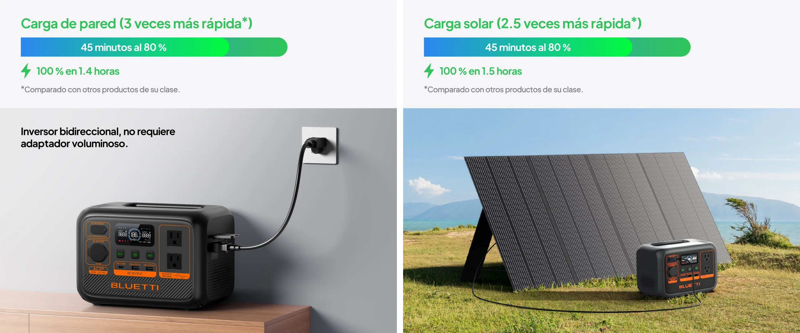 - Paneles solares (200W): ≈1,5 Horas (Con sol radiante, orientación ideal y baja temperatura)